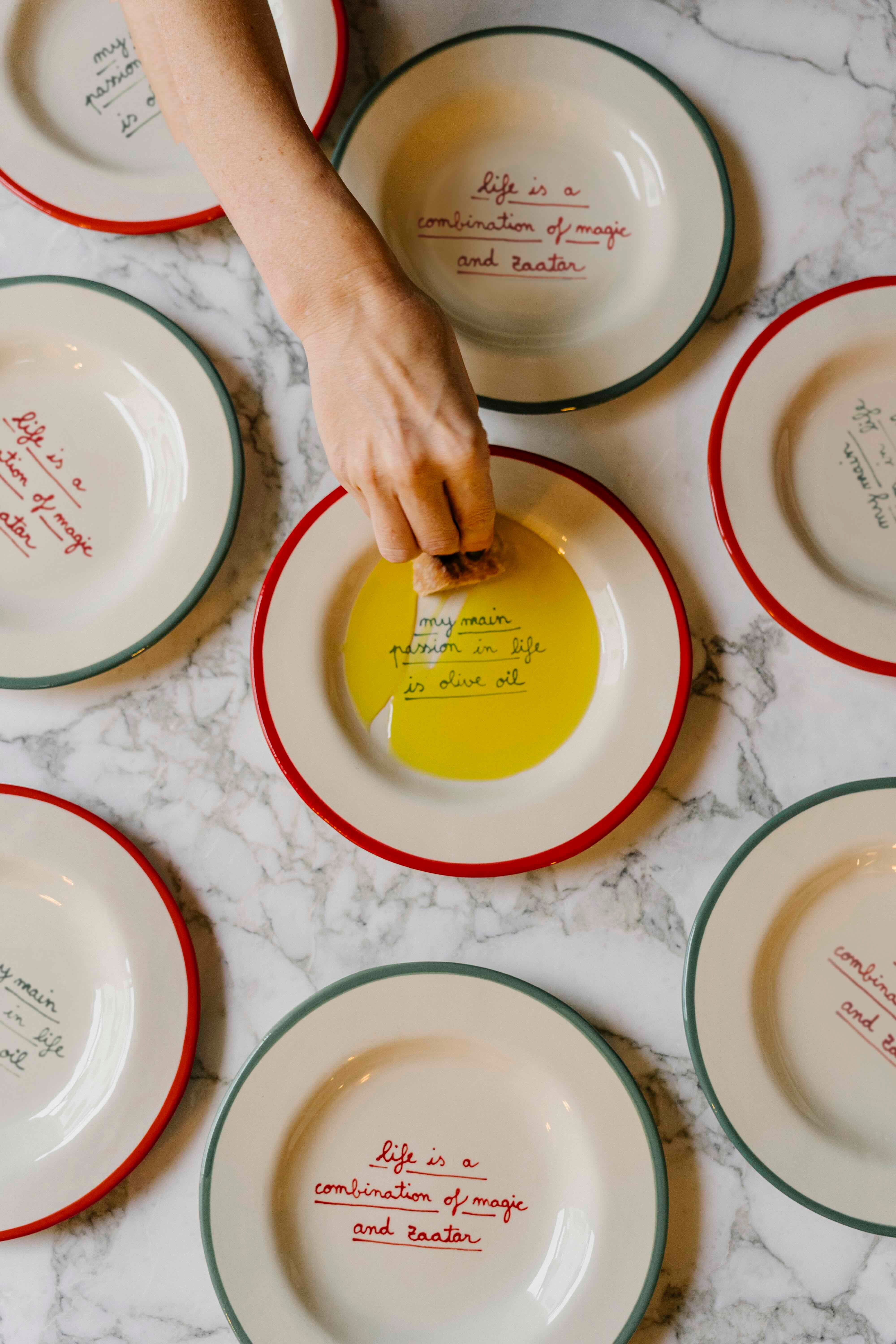 Her plates are fun and the sayings she chooses are bound to put a smile on your face. Some of our best-sellers feature her signature phrases like “naughty boy” and “dirty dancing,” little bursts of personality that have become part of her charm. Earlier this year, I reached out to Laetitia with an idea for two plates inspired by flavours at the heart of Middle Eastern tables, ones I love and knew would resonate deeply with our community: olive oil and za’atar. Simple, essential, and never missing from the table, they’re more than ingredients; they’re an instant shorthand for home. I’m thrilled to share that these plates are now live on our website.