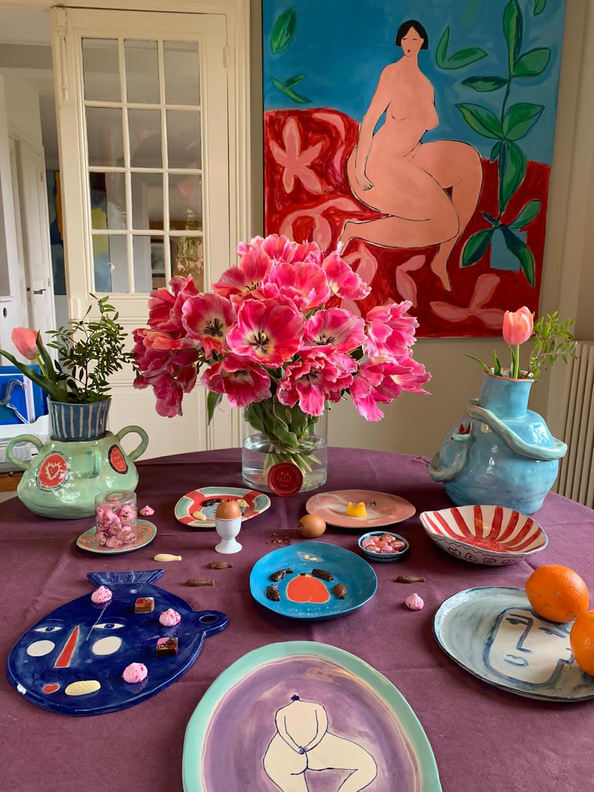 For me, setting the table is like staging a small play. I love to play with colour, form, and a touch of the unexpected. I don’t follow strict rules; I mix shapes, textures, and whatever props I find around me, whether from nature or my studio. I like the table to feel alive, slightly imperfect, as if everything has its own little story. What matters most to me is the atmosphere, that sense of generosity and play, rather than precision.